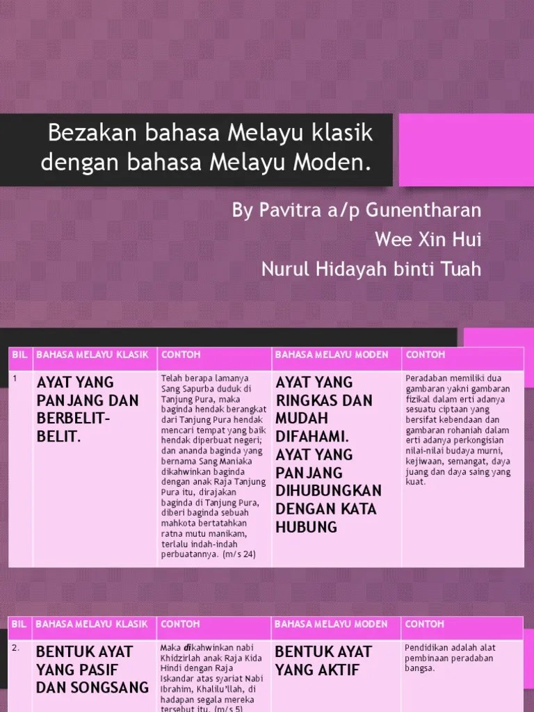Contoh Petikan Bahasa Melayu Klasik / Eduristic Malaysia On Twitter Proses Penukaran Bahasa Melayu Klasik Kepada Bahasa Melayu Standard 1 Baca Seluruh Petikan Sehingga Faham 2 Gariskan Perkataan Perkataan Klasik 3 Tukarkan Perkataan Klasik Tersebut Kepada Perkataan Moden. Contoh penukaran bahasa melayu klasik/ tradisional: . Arakian, syahadan, hatta, alkisah, kata sahibul hikayat, maka, tatkala, adapun dan sebagainya. Adapun hikayatnya terlalu amat lanjut; Tukarkan ayat bahasa melayu klasik . Susunan ayat hendaklah mengikut susunan bahasa melayu moden/ baku. Contoh ayat tersebut dapat dilihat dalam teks sulalatus salatin tulisan a.samad ahmad iaitu;. Perkataan klasik yang ada dalam petikan tersebut,.